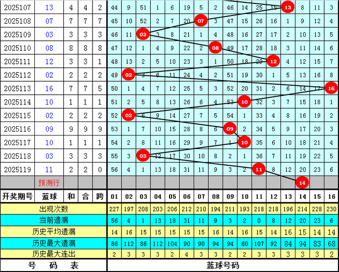 蓝球号码分析:上期蓝球为11,开出2路号码,蓝球最近10期012路比为3:3:4,最近30期012路比为7:13:10,最近100期012路比为30:37:33,本期蓝球看好2路号码,四码蓝球参考02、05、08、14。