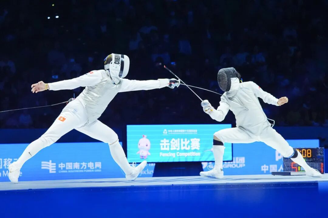 ▲张家朗(左)在男子花剑个人赛取得铜牌。