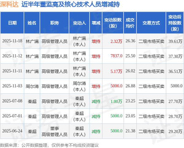 深科达近半年内的董监高及核心技术人员增减持详情如下: