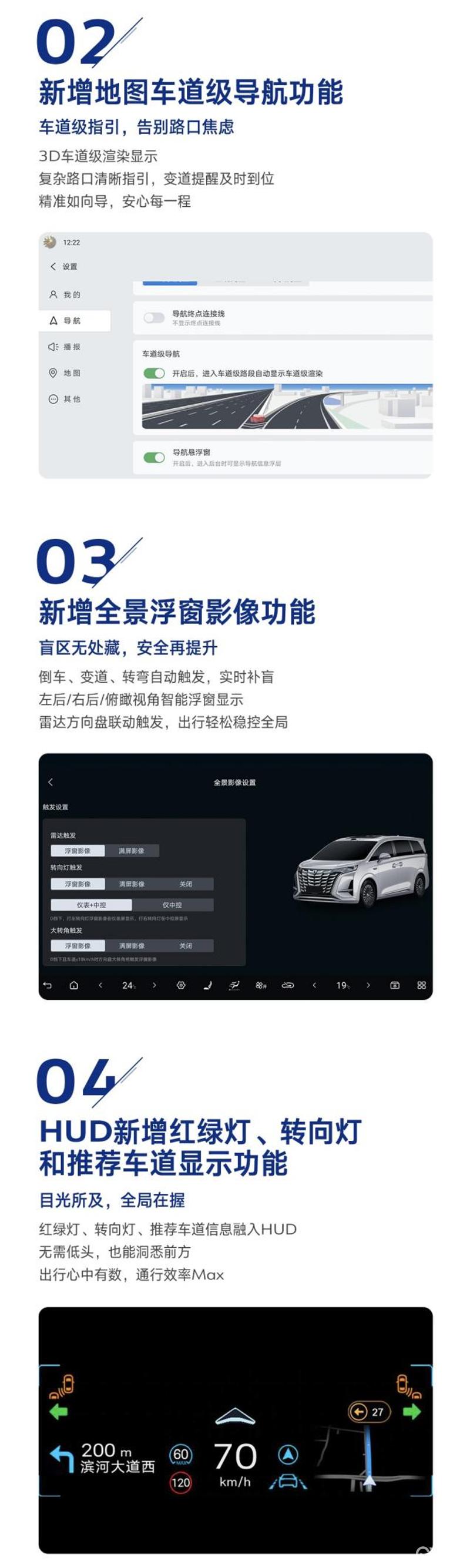 此次OTA新增地图车道级导航功能,通过精细的3D车道级渲染,提供精准的导航指引,变道提醒及时到位,避免在复杂路口因车道选择错误导致的绕行。同时,新增的全景浮窗影像功能可在倒车、变道、转弯时自动触发,实时补全盲区,让驾驶者轻松稳控全局。此外,HUD显示信息也更加丰富,新增红绿灯、转向灯和推荐车道显示功能,驾驶者无需低头便能洞悉全局,让通行效率最大化。