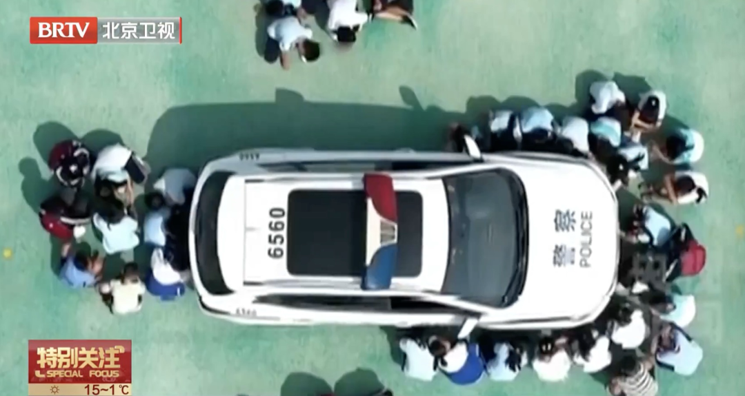 这是山东莱西交警进行的一次模拟实验。93名儿童蹲在车辆四周盲区,坐在车内的老师,无论通过车窗还是后视镜,都完全看不到孩子们的身影。