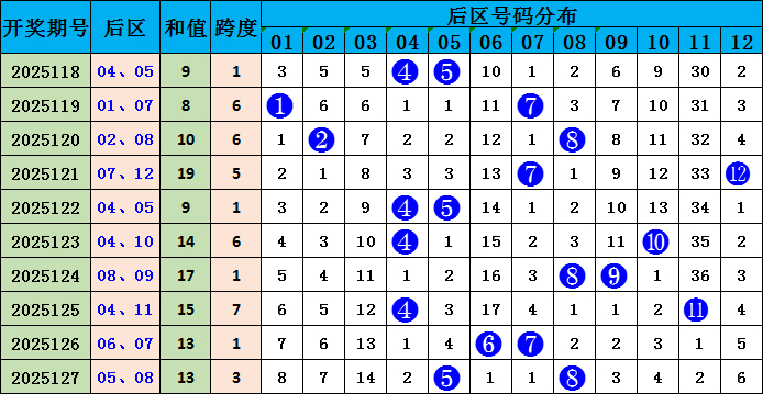 后区分析:上期后区开出号码05、08,为小大奇偶组合。