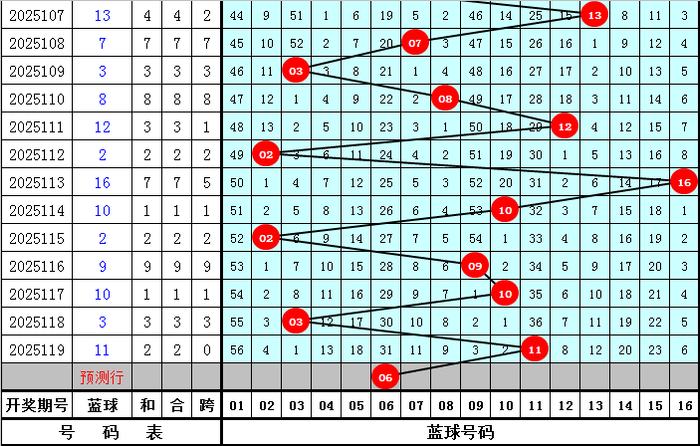 前9期开出7个蓝球号码,蓝球以冷码为主,热码蓝球开出相对较少,还没有出现的蓝球为:01、04、05、06、07、08、13、14、15,共9个,本期防蓝球为冷码,遗漏值较大,参考蓝球号码06。