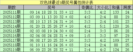 双色球上期第2025119期奖号为06 09 23 26 28 32 + 11,红球号码奇偶比为2:4,大小比为4:2,和值为124,跨度:26。
