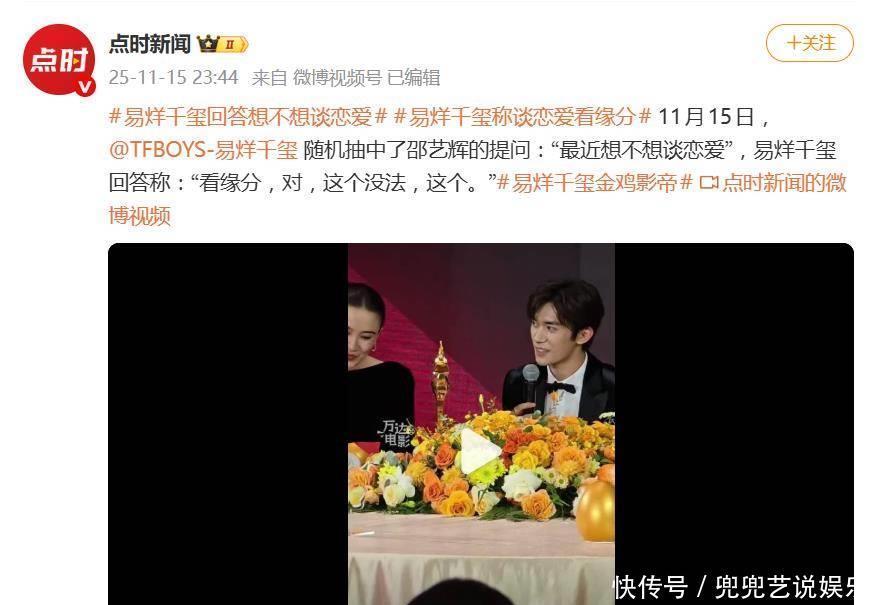 11月15日,易烊千玺刚凭电影《小小的我》斩获第38届金鸡奖最佳男主角,成为最年轻影帝,就在后台遭遇“灵魂拷问”——被导演邵艺辉提问“最近想不想谈恋爱?”这波操作瞬间让话题冲上热搜。在金鸡奖后台的“砸金蛋”互动环节,易烊千玺随机抽中了邵艺辉导演事先准备的提问纸条。一看问题,他当场翻了个白眼,表情无奈又好笑,引得全场笑声一片。短暂停顿后,他才略带局促地回应:“看缘分,对,这个没法……这个。”语气之间满是“打工人被催婚”式的真实反应。