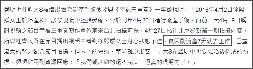 而这两次流产经历前,大S的怀孕都没什么征兆,该工作就工作,还被网友偶遇陪全家去越南度假,流产后也没有休养,总是一直在为家庭考虑。