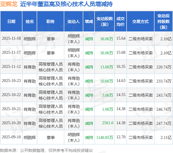 亚辉龙近半年内的董监高及核心技术人员增减持详情如下: