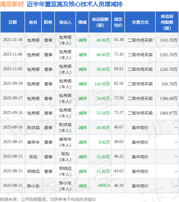 南亚新材近半年内的董监高及核心技术人员增减持详情如下: