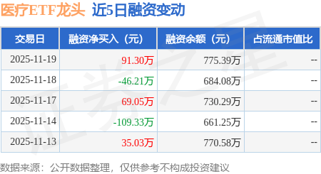 本站消息,11月19日,医疗ETF龙头(560260)融资买入102.6万元,融资偿还11.29万元,融资净买入91.3万元,融资余额775.39万元,近20个交易日中有11个交易日出现融资净买入。
