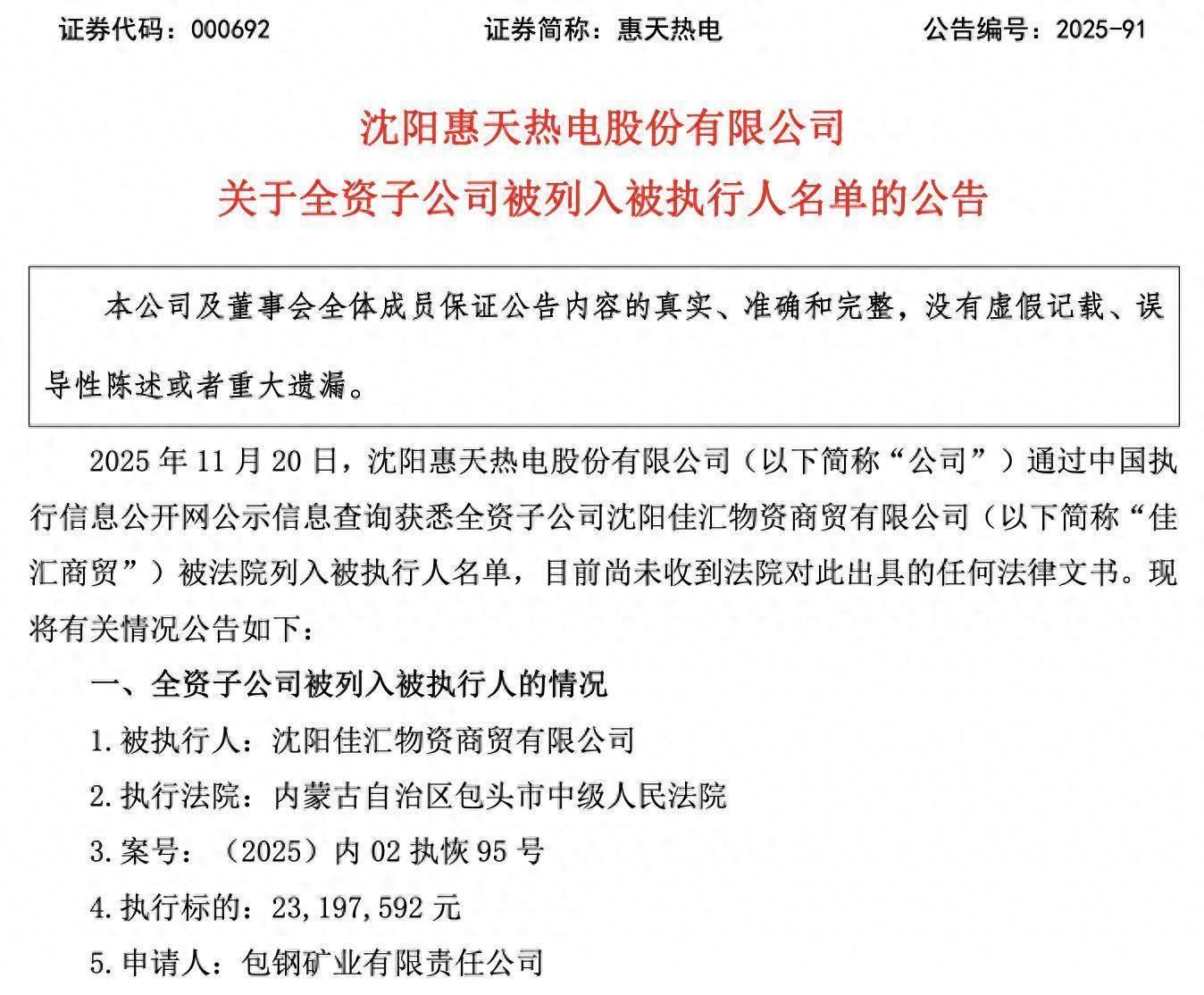 11月20日晚正规配资平台推荐,惠天热电(000692)公告,公司通过中国执行信息公开网公示信息查询获悉,全资子公司沈阳佳汇物资商贸有限公司(简称“佳汇商贸”)被法院列入被执行人名单,目前尚未收到法院对此出具的任何法律文书。