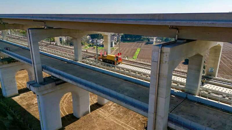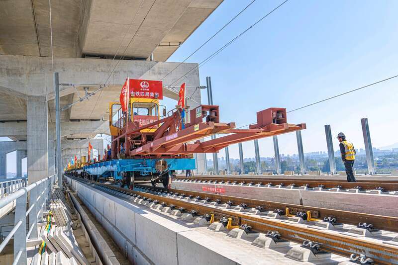 此次铺轨采用的国产WZ500型自动抓取式铺轨机组,由我国自主研发。施工单位中铁四局项目经理吴辰龙介绍,该铺轨机组电气控制系统可实现各动作的精确协调,控制误差小于5毫米。机组抓取装置采用先进液压夹轨器,单日最快铺轨进度可达6公里。