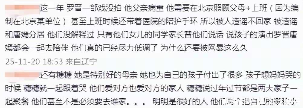父亲走后,罗晋立刻停掉了所有公开行程,微博定格在他参加活动那天。而唐嫣的账号却在18号、20号更新了,转发反军国主义的内容,IP显示上海。有人立马跳出来说,“你看,关键时刻不提家里事,肯定有问题”。但也有网友看明白,工作室在打理账号很正常,说不定她正留在上海照顾孩子,让罗晋安心处理后事。