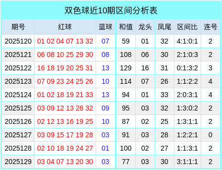 当期红球号码大小比为2:4,三区比为3:2:1,奇偶比为3:3,当期红球开出1组连号03,04,未开出重号。蓝球则是开出形态为【小奇】的号码03。