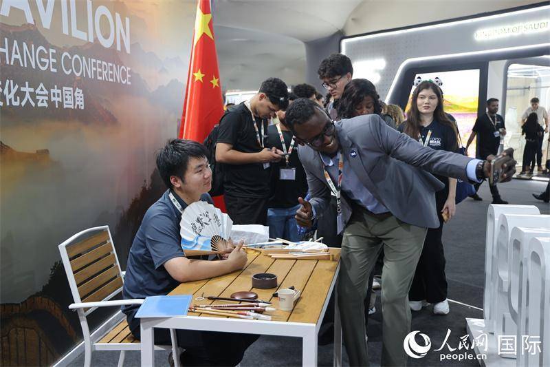 “中国角”外围正规配资平台,参观者与在折扇上进行书法创作的工作人员合影。人民网记者 时元皓摄