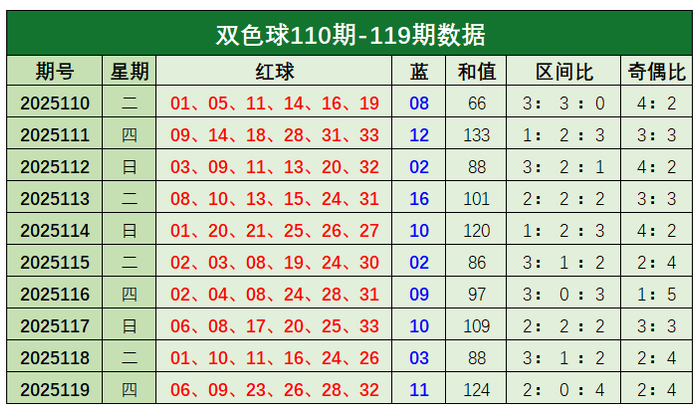 上期和值为:124,近10期和值分别为:66、133、88、101、120、86、97、109、88、124,预计本期和值走势范围下降,本期推测红球和值出现范围在95-100区间。