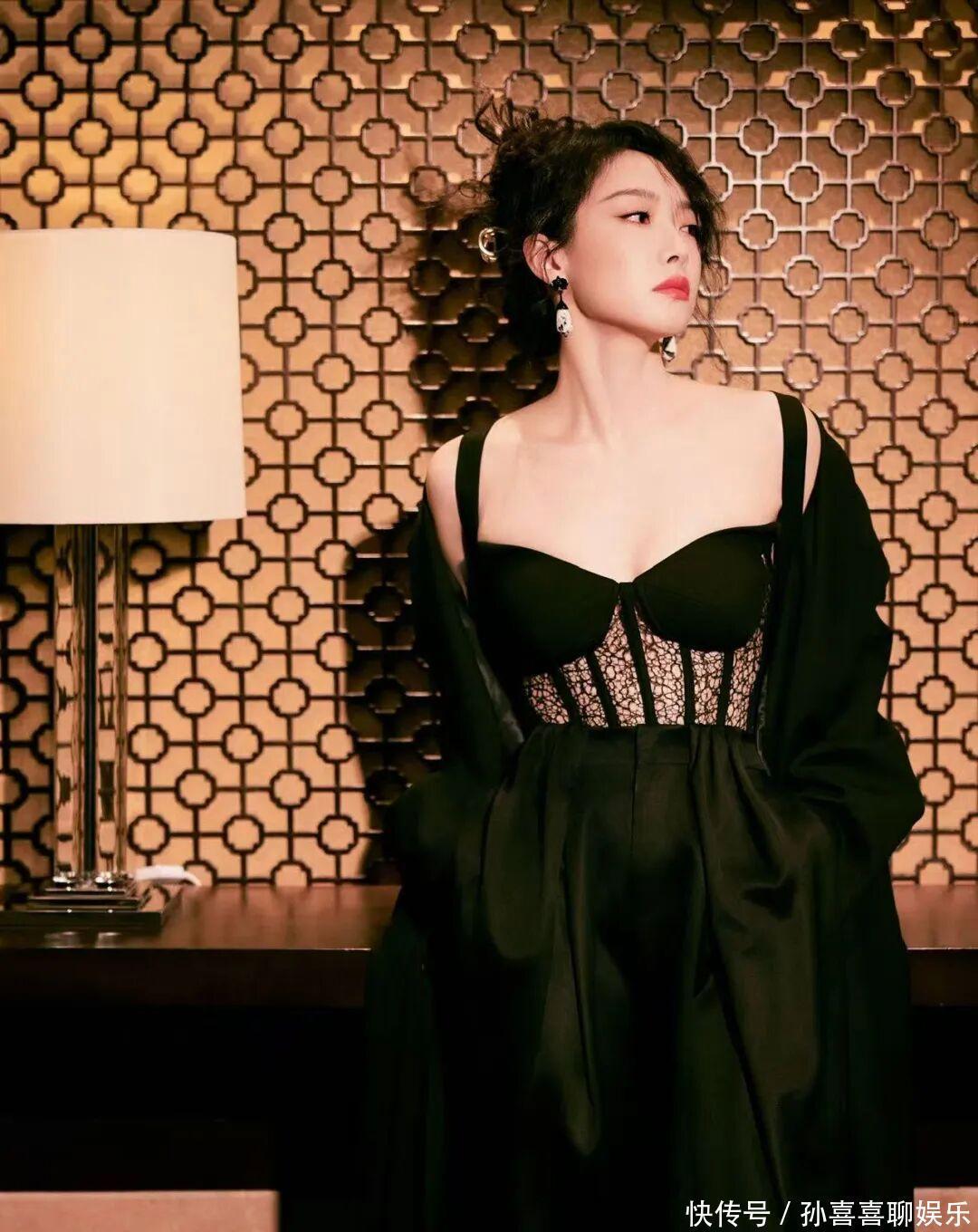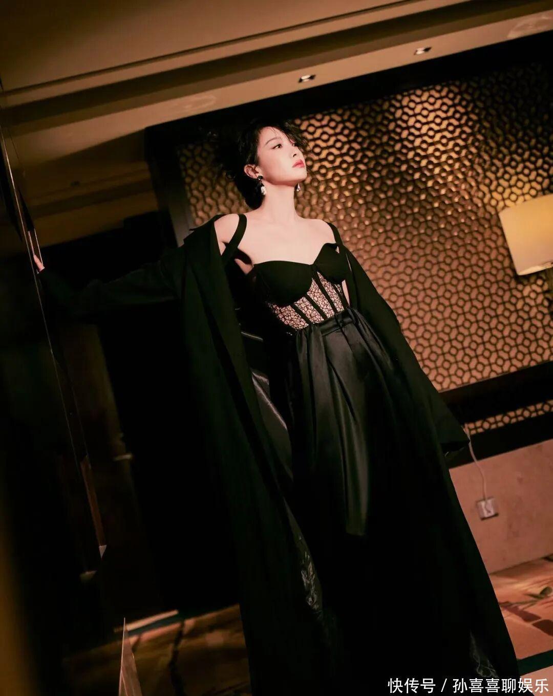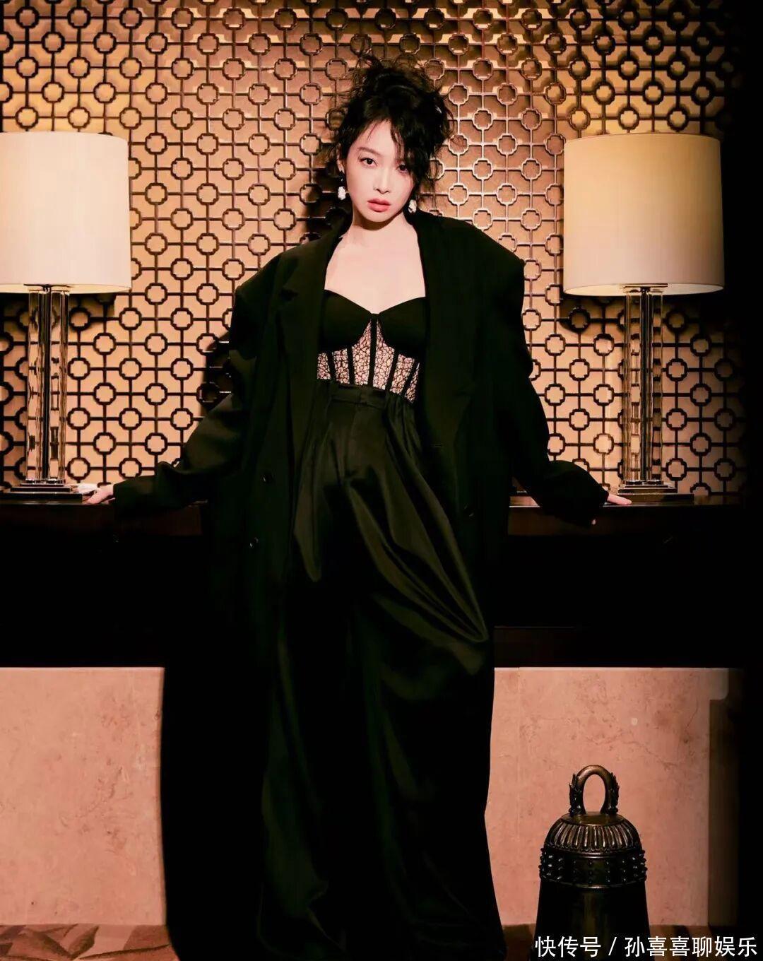 宋茜身穿蕾丝胸衣外搭黑色大衣,一身All Black穿搭又美又飒,绝对性感撩人!