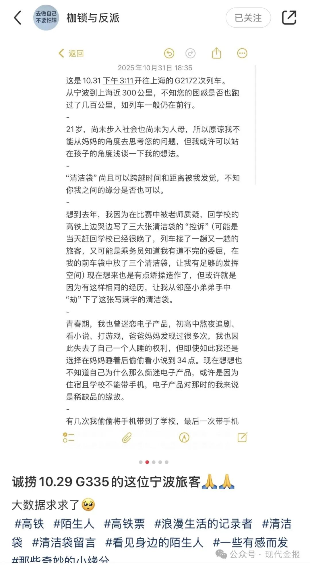 留言落款为“一位宁波旅客的唠叨