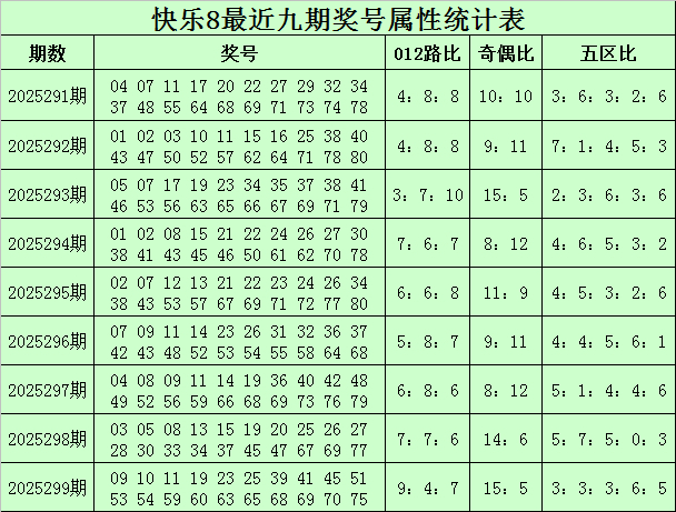 福彩快乐8第2025299期奖号为:09 10 11 19 23 25 39 41 45 51 53 54 59 60 63 65 68 69 70 75,其中奖号012路比为9:4:7,奇偶比比为15:5,大小比为13:7,五区比为3:3:3:6:5。